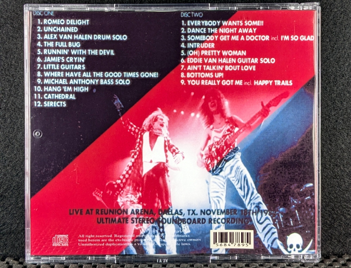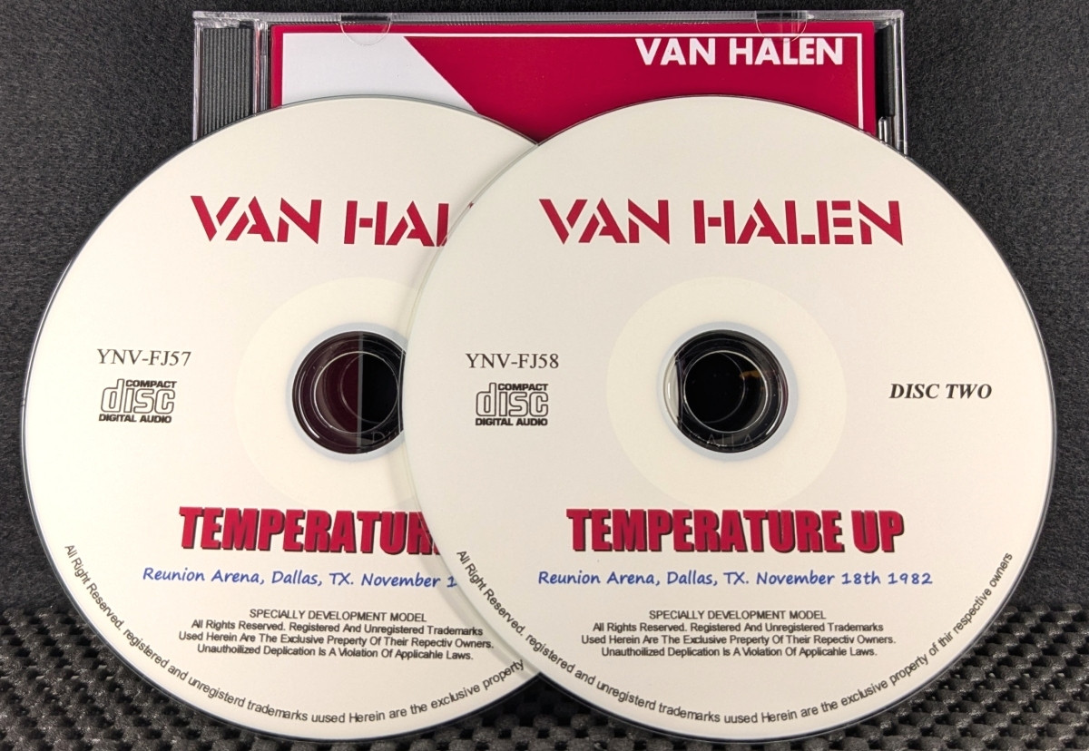 | ron (12220) | Van Halen – Temperature Up 1982 Remastered Edition Enjoy this digitally remastered performance from the Dallas, Texas Reunion Arena concert on November 18, 1982, from the world tour that accompanied the release of “DIVER DOWN.” This disc includes rare tracks like the never-before-played “The Full Bug,” a cover of the Kinks’ “Where Have All the Good Times Gone!” and “Hang ‘Em High.” Also featured are the solos from each member, unique to live performances. Eddie’s solo near the end is a must-listen for fans. Tracklist DISC ONE DISC TWO Type: Soundboard ronQuote |