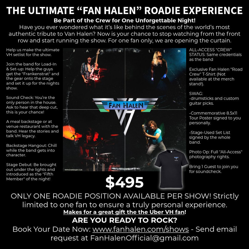 ron(12302) |  THE ULTIMATE FAN HALEN ROADIE EXPERIENCE IS HERE!?? Stop watching from the front row and start running the show! We’re giving ONE super-fan per show the chance to ditch their day job and join the actual crew for The Ultimate “FAN HALEN” Roadie Experience! This isn’t just a backstage pass–it’s an all-access, high-voltage dive into the world of the world’s most authentic Van Halen tribute. YOUR BEHIND-THE-SCENES ALL ACCESS INCLUDES: * The Setlist: Help us curate the ultimate VH setlist for the show. * Load-In & Set-Up: Help the guys get the “Frankenstrat” and all the gear onto the stage. * Solo Sound Check: You’re the only person in the house. This is your chance to hear that deep cut! * Meal Backstage: Eat with the band and hear their stories and VH legacy talk. * Backstage Hangout: Chill while the band gets into character. * Stage Debut: Be brought out under the lights and introduced as the “Fifth Member” of the night! * All-Access “Crew” Status: Get the same credentials as the band. * Exclusive T-Shirt: Receive an exclusive Fan Halen “Road Crew” T-Shirt (not available at the merch stand!). * Swag: Custom drumsticks, picks, a personalized 8.5×11 tour poster, and a stage-used setlist signed by the band. * Photo Op: Full “All-Access” photography rights. * Bring a Guest: 1 guest can join you for the soundcheck! —– SECURE YOUR SPOT NOW: This exclusive opportunity is available for ONE FAN ONLY PER SHOW to ensure a truly personal experience. It makes for a great gift for the Uber VH fan! Are you ready to rock? Choose your date now at https://www.fanhalen.com/shows and send an email request to FanHalenOfficial@gmail.com .