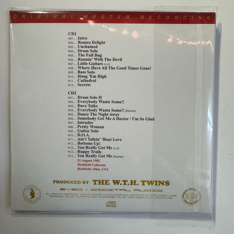 | jorge (558) | http://www.thetradersden.org/forums/showthread.php?t=215408 Van Halen Lineage: Maxell UDXL-I C-90 cassette > Nakamichi DR-1 (azimuth adjustment) > Creative Sound Blaster X-Fi HD > Audacity (24-96) > FLAC 6 Track Listing: 01 Intro Notes: This show features something very unique during the Doctor / Glad jam, which would slowly evolve and extend over the course of the tour. Exclusively here in Richfield, Eddie plays a bit of Panama, showing us just how early the idea for the song was in his head. Unfortunately this show is as close to a trainwreck as you’ll get. No doubt it’ll be the worst you’ll hear from this tour. It’s hard to not write an essay pointing out every little issue, so I tried to keep it summarized. It’s really something you have to experience yourself. This is easily the worst night for Dave the entire tour. It’s hard to be sure if he had a cold, as there were subtle signs of this a week prior in Detroit. Perhaps it’s a combination of that, and/or substance abuse. Throughout the show you will hear various instances where he’s really struggling, often times not even trying to hit the notes, rather just sort of speaking through the lyrics. Even Eddie isn’t totally on point tonight, throughout the show there are instances where he fumbles his parts. Not all the issues are his fault though, which comes to the biggest flaw with this show: the sound system. There’s no explanation for what was going on with the sound system tonight, but it is certain that all the issues noticeably plagued this concert, for the crew, band, and audience. For the first few songs, and at some points later, there is a constant clicking noise, which I believe is related to one of the drum mics. Secondly, the mix is awful. The vocal and instrument levels are individually at times either loud and blown out, or very quiet, sometimes nearly inaudible. Sometimes the levels go up and down during a single song. A good example is Unchained, which has weird wavering. Another good example is The Full Bug, which is further plagued by mic feedback. Other notable examples are the guitar dropout during Ain’t Talkin’ ‘Bout Love, and the delays prior to Happy Trails. During Eddie’s guitar solo there are parts where he starts having issues, and pauses longer than he usually would. The climax of these issues start being heard during Cathedral, then right as they start Secrets, the issues finally derail the show. Ed’s guitar isn’t coming through, causing the band to stop playing. Dave tries to play it off and blame the sound crew, but it doesn’t hide the fact that the entire night had been cursed. Perhaps all the issues during this show in Richfield could’ve been due to exhaustion of the band and sound crew, having been the fifth night in a row without a day off. This was also the last show of the first leg of the tour, until resuming on the west coast on September 1st. Interestingly, this was the only tape in Roy’s collection that was unlabeled. Perhaps he intended to record over it. Perhaps he didn’t want to remember it, which clearly wasn’t a shining moment for his career. The first cut in the recording is where Roy would often pause to save space, during the break where Dave would talk to the crowd following Runnin’ With The Devil. It seems on this night that he must’ve forgotten to start recording again, since it cuts Jamie’s Cryin’ and the first half of Little Guitars. The first side of the 90 minute master tape ends during Dave’s Everybody Wants Some storytime interlude, though the tape is flipped very quickly and not missing much. Roy later paused the tape after Somebody Get Me A Doctor, so did not capture any of Dave’s acoustic solo or Ice Cream Man. The tape starts again in time for Intruder. Lastly, Roy paused during the encore breaks, but forgot to start again in time, so most of the first part of You Really Got Me is cut. Huge thanks to those who significantly helped with the absurd pricetag that was required to liberate this VH collection, most of which would’ve been impossible to save otherwise. Enjoy the music and be grateful we are able hear these special recordings. If you have uncirculated tapes, please consider sharing them before they end up forever lost to time. jorgeQuote |